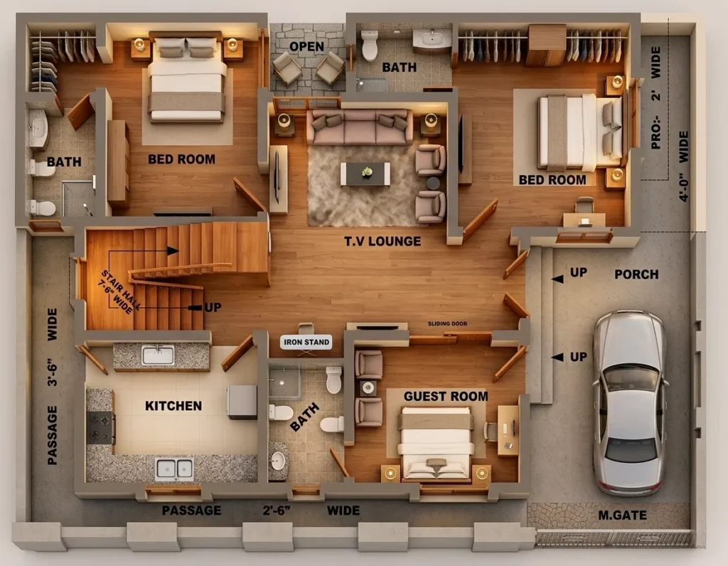 The kitchen is spacious and well-placed with easy access to the back service areas. The main gate opens into a generous 12′ × 21′-9″ porch — wide enough for covered car parking. The stair hall is 7′-6″ wide, offering a comfortable and grand ascent to the upper floor.